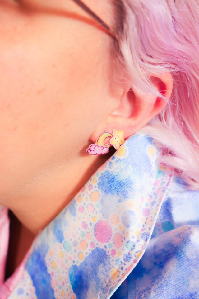 Les boucles d'oreilles Luna sont entièrement fait main en plastique fou et résine et sont montées sur un pique en acier inoxydable (pour éviter au maximum les allergies, c'est un métal garanti sans nickel).
