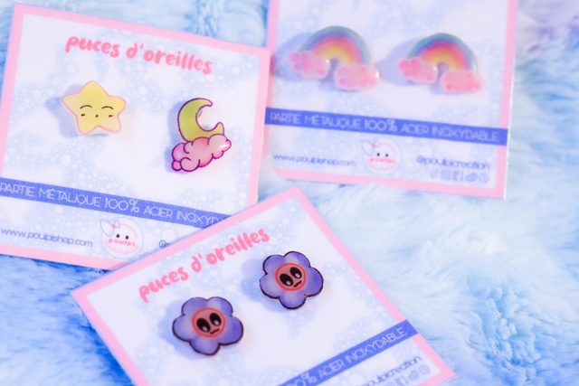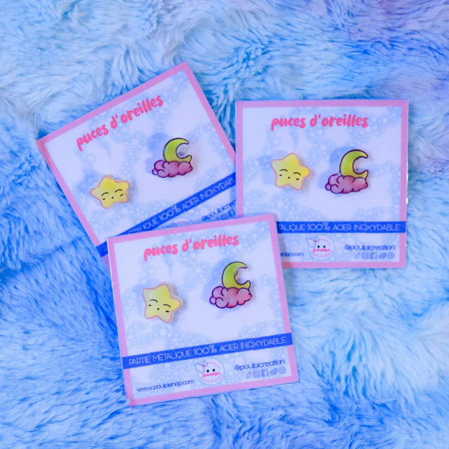 Chez poulpi on adore l'asymétrie, la symétrie c'est un peu trop sage tu trouves pas ?! Des boucles d'oreilles dépareillées avec une mignonne étoile d'un coté et une petite lune de l'autre.