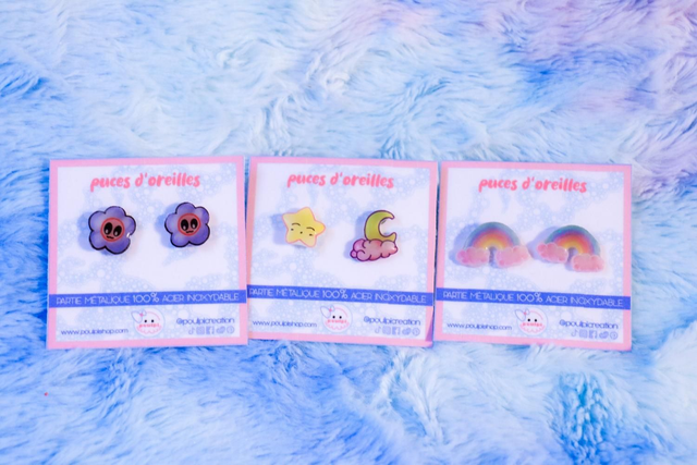 Les boucles d'oreilles rainbow sont entièrement fait main en plastique fou et résine et sont montées sur un pique en acier inoxydable (pour éviter au maximum les allergies, c'est un métal garanti sans nickel).