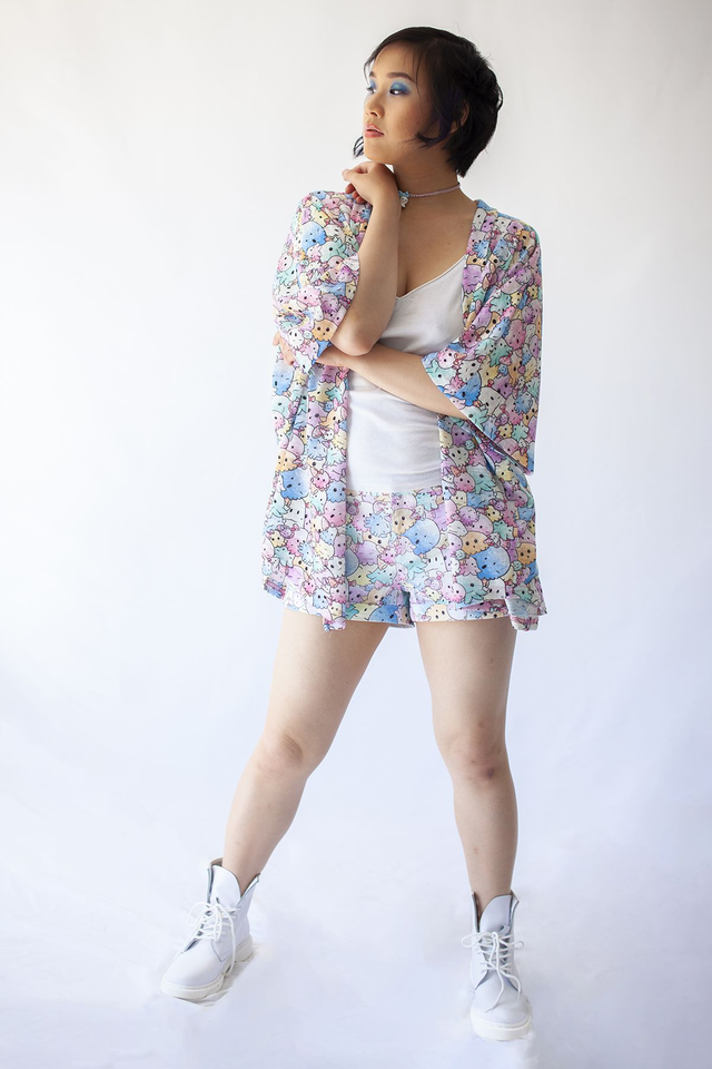 L'imprimé poulpettes est très présent, on recommande donc de ne pas le mixer avec d'autres imprimés. Optez pour un haut uni clair. Ou, pour un look très fort, pourquoi ne pas l’associer au kimono Yume du même motif ?