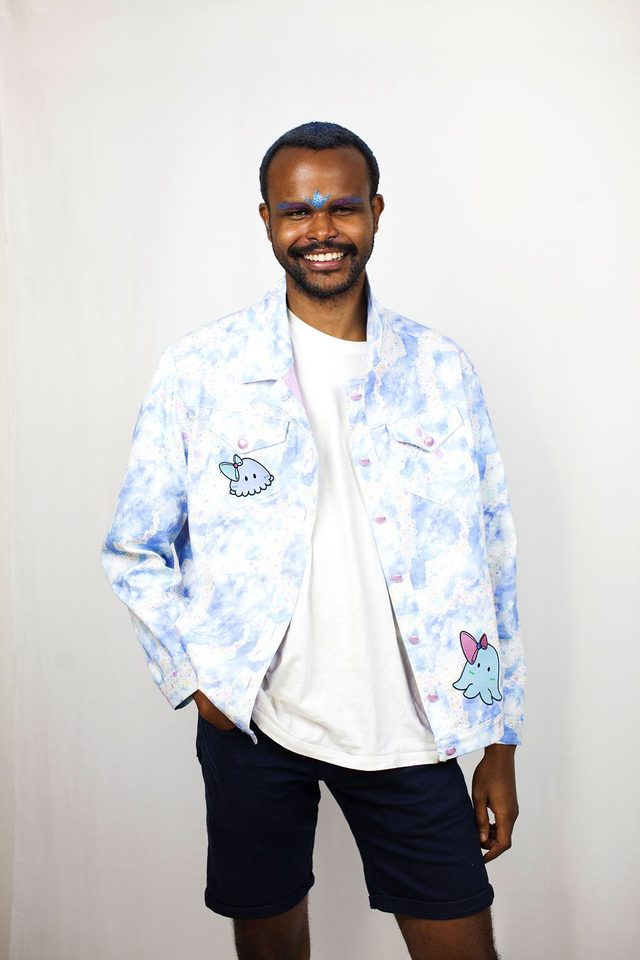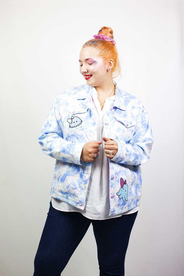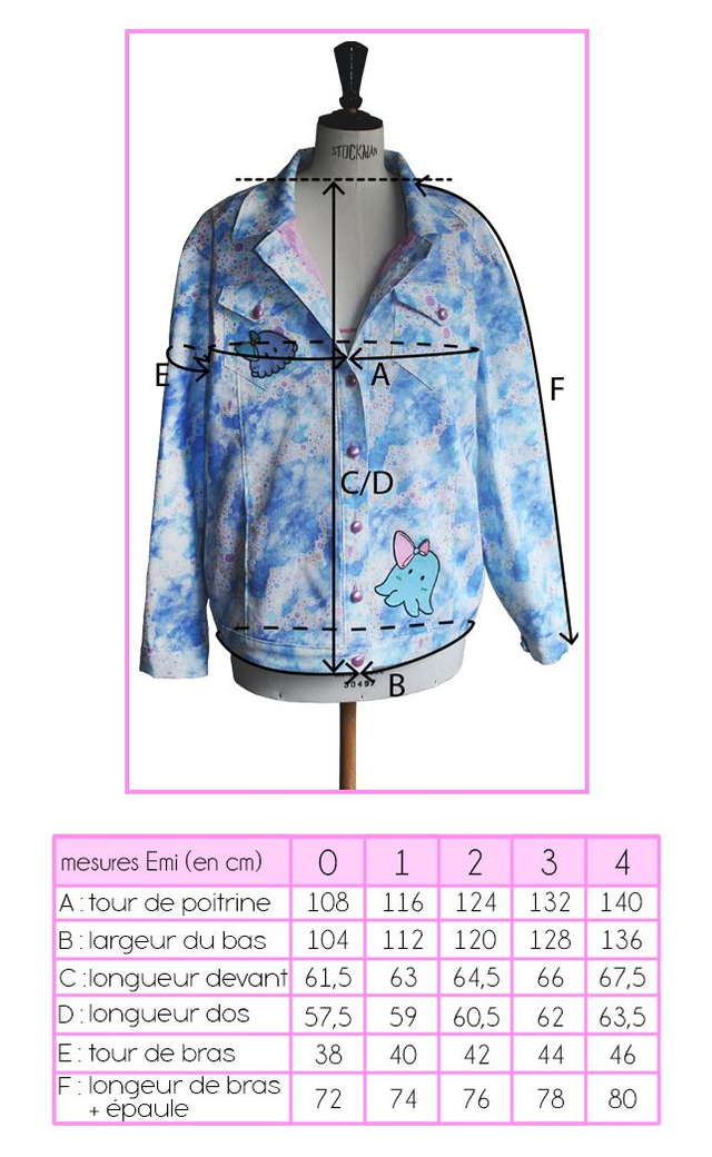 Emi n'est-elle pas la veste en jean la plus mignonne que vous ayez jamais vue ? La coupe étant celle d'une veste en jean ordinaire un peu large, elle va très bien à tout le monde. Elle a dans son dos un gros patch Risa, Saki et Kimi sont aussi de la partie : elles ont chacune un plus petit patch à leur effigie sur les poches devant. Les boutons rose nacré contrastent bien avec l'imprimé bleu ciel et collent parfaitement avec la doublure à pois.