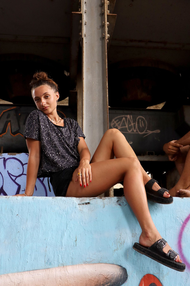 Il existe 2 tshirts dans la collection black&white : Le Kumi : crop top, très large, avec un col bateau et une petite poche sur la potrine, et le Koto : modèle unisexe long et à col rond un peu oversize .